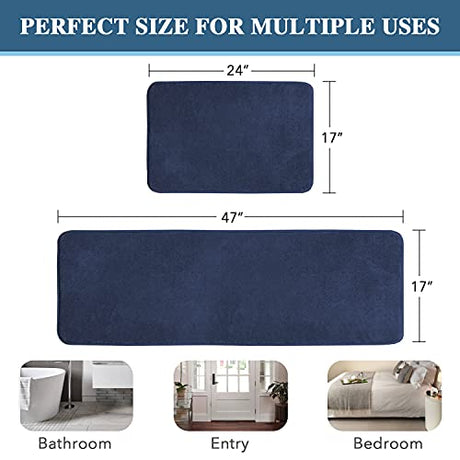 Kitchen Mat Set of 2 Memory Foam Set Bathroom Rug Set Flannel Velvety Bath Mat Luxury Extra Soft and Absorbent Non Slip Rugs for Kitchen/Bathroom Washable(47"x 17"/ 17"x 24", Navy)