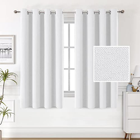 100% Blackout Linen Curtains 63 inches Long Thermal Curtains for Living Room Textured Burlap Curtains with Double Face Linen Grommet Soundproof Bedroom Curtains 52 x 63 Inch, 2 Panels - White