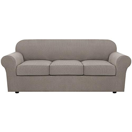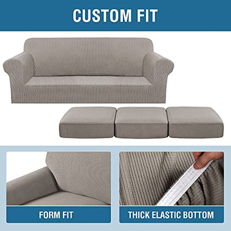 H.VERSAILTEX 4 Piece Stretch Sofa Covers for 3 Cushion Couch Covers for Living Room Furniture Slipcovers (Base Cover Plus 3 Seat Cushion Covers) Upgraded Thicker Jacquard Fabric (Sofa, Taupe)
