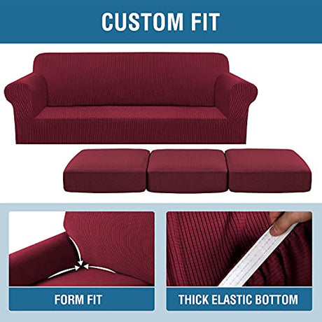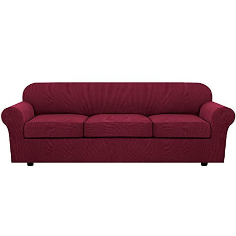H.VERSAILTEX 4 Piece Stretch Sofa Covers for 3 Cushion Couch Covers for Living Room Furniture Slipcovers (Base Cover Plus 3 Seat Cushion Covers) Upgraded Thicker Jacquard Fabric (XL Sofa, Burgundy)