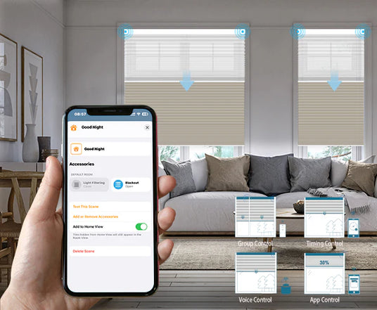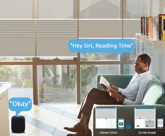 Explore the advanced features of our smart blinds, beyond just timed and group controls. Scene control customizes your shades for different activities – like automatically closing when you say 'Watching Movies'. Sync them with other Matter-certified devices for a seamless experience. The Sunrise/Sunset setting lets your shades rise with the morning sun and close at dusk, effortlessly aligning with your daily routine. Discover these and more functions to enhance your smart home experience.