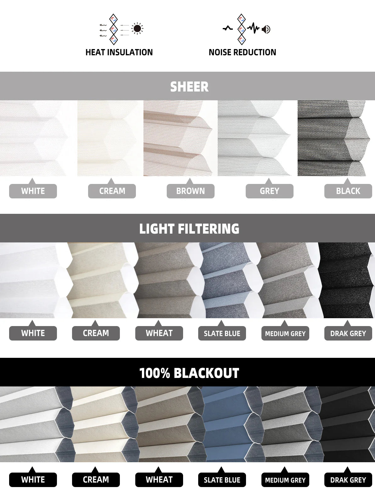 Composed of two cellular honeycomb fabrics that can be moved independently, one for light filtering and another for blackout. Offering varying levels of light control and privacy, allows you to switch between the light filtering and blackout options at ease, providing you with precise control over the amount of light entering your room and the level of privacy you require. When you want to take advantage of natural light in the daytime, you can use the light filtering fabric; when you need complete darkness during the night or at movie time, you can use the blackout fabric.